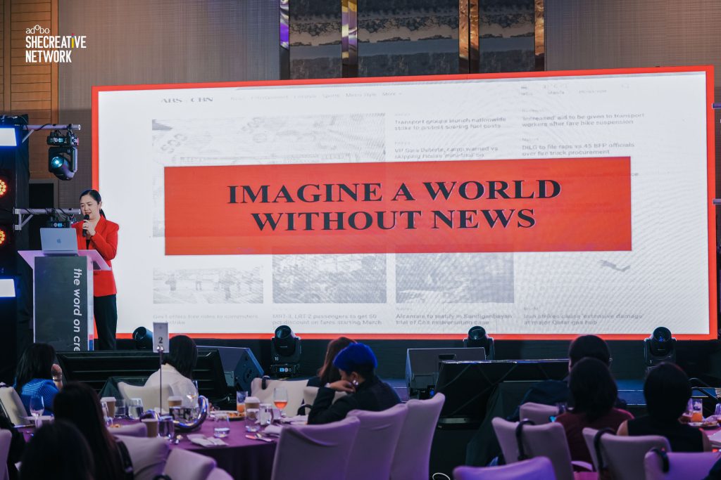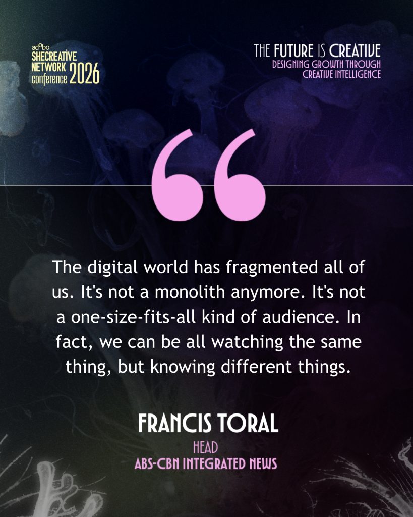 With AI-generated media made easily accessible to the masses and pervading all platforms, it can be hard to distinguish fact from fake assumptions. And with important events happening all the time, it’s crucial to have a credible source of information. This is precisely what Francis Toral, Head of ABS-CBN Integrated News and Current Affairs, talked about during her presentation at the recent adobo SheCreative Network Conference, “The Future Is Creative: Designing Growth Through Creative Intelligence” held on March 24, 2026.
